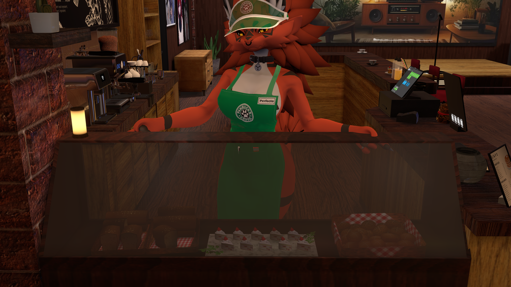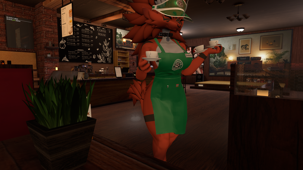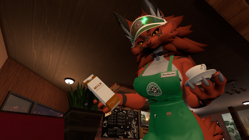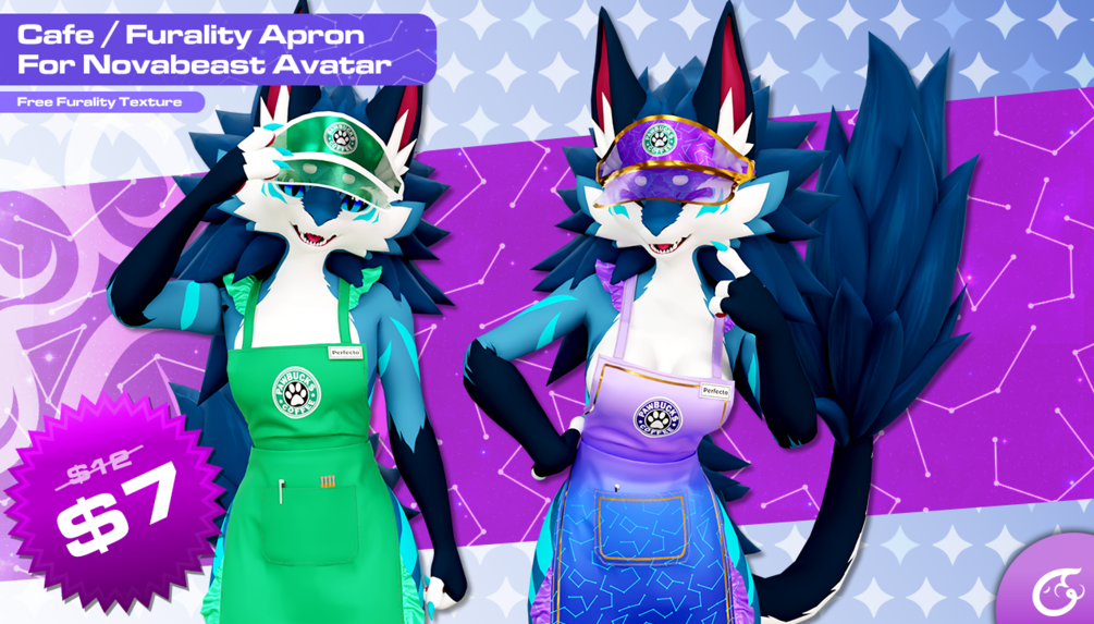 Like I always say, Nova can take up any role. How about now you guys play the role of the hot barista guy or gal at your favourite cafe? Here's my newest creation: an awesome customisable apron and a cap that reflects the cafe's brand. There's a special Texture version I made for Furality that can be worn, volunteer for being a Furality-themed Barista, hehe.